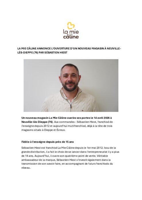 Snacking 13 avril 2026 - 11:36 Un nouveau magasin La Mie Câline ouvre ses portes le 14 avril à Neuville-lès-Dieppe (76). Aux commandes : Sébastien Hiest, franchisé de l’enseigne depuis 2012 et aujourd’hui multifranchisé, déjà à la tête de trois magasins situés à Dieppe et Évreux. PDF (99 Ko) Télécharger
