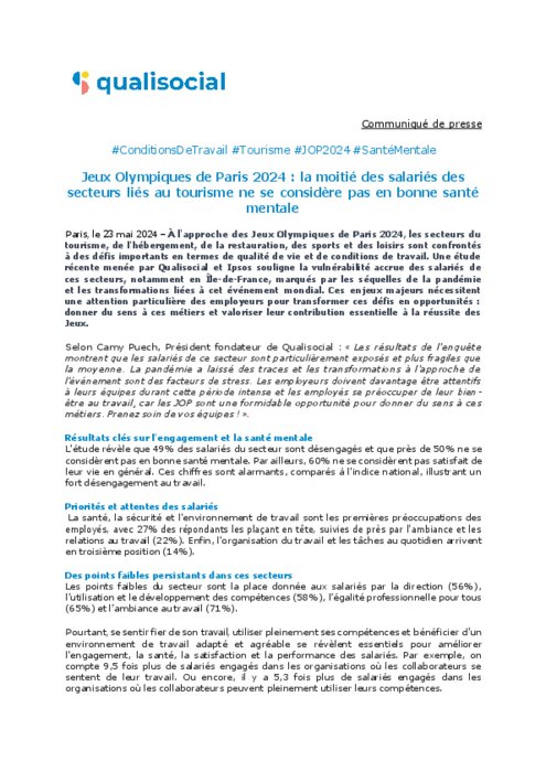 À l'approche des Jeux Olympiques de Paris 2024, les secteurs du tourisme, de l'hébergement, de la restauration, des sports et des loisirs sont confrontés à des défis importants en termes de qualité de vie et de conditions de travail. Une étude récente menée par Qualisocial et Ipsos souligne la vulnérabilité accrue des salariés de ces secteurs, notamment en Île-de-France, marqués par les séquelles de la pandémie et les transformations liées à cet événement mondial. Ces enjeux majeurs nécessitent une attention particulière des employeurs pour transformer ces défis en opportunités : donner du sens à ces métiers et valoriser leur contribution essentielle à la réussite des Jeux.
