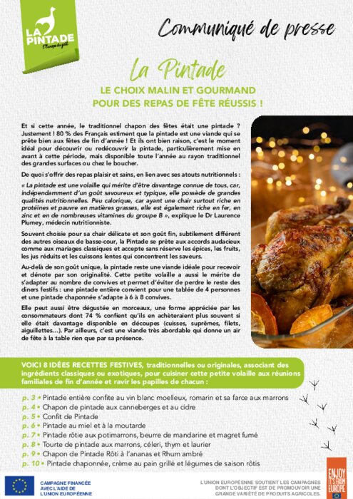 Et si cette année, le traditionnel chapon des fêtes était une pintade ?  80 % des Français estiment que la pintade est une viande qui se prête bien aux fêtes de fin d’année ! Et ils ont bien raison, c’est le moment idéal pour découvrir ou redécouvrir la pintade, particulièrement mise en avant à cette période, mais disponible toute l’année au rayon traditionnel des grandes surfaces ou chez le boucher.