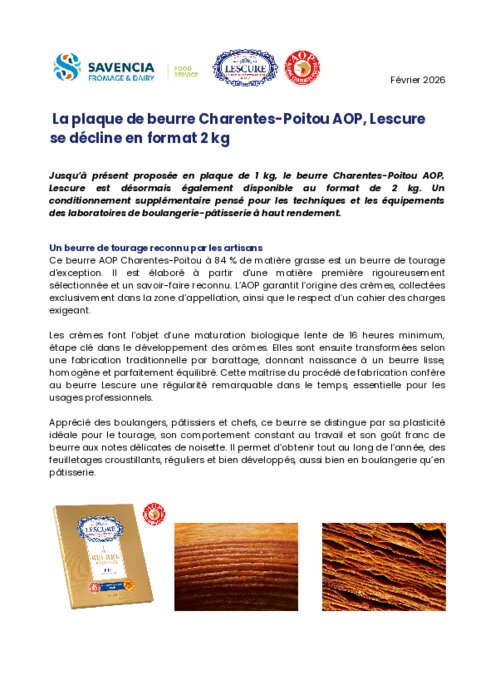 Jusqu’à présent proposée en plaque de 1 kg, le beurre Charentes-Poitou AOP, Lescure est désormais également disponible au format de 2 kg. Un conditionnement supplémentaire pensé pour les techniques et les équipements des laboratoires de boulangerie-pâtisserie à haut rendement.