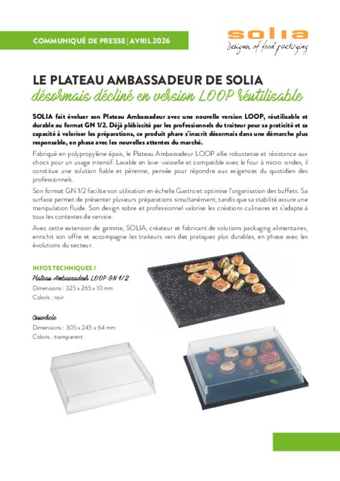 Solia fait évoluer son Plateau Ambassadeur avec une nouvelle version loop, réutilisable et durable au format GN 1/2. Déjà plébiscité par les professionnels du traiteur pour sa praticité et sa capacité à valoriser les préparations, ce produit phare s’inscrit désormais dans une démarche plus responsable, en phase avec les nouvelles attentes du marché.
