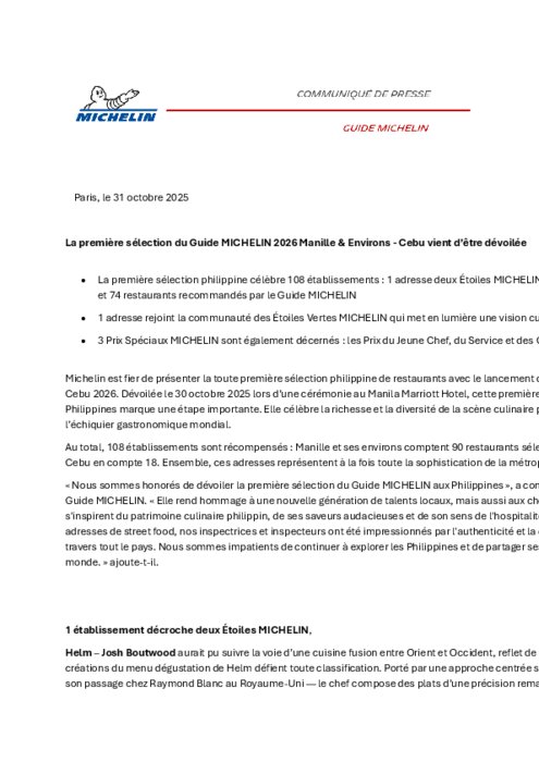 Michelin est fier de présenter la toute première sélection philippine de restaurants avec le lancement du Guide Michelin Manille et Environs – Cebu 2026. Dévoilée le 30 octobre lors d’une cérémonie au Manila Marriott Hotel, cette première édition du Guide Michelin consacrée aux Philippines marque une étape importante. Elle célèbre la richesse et la diversité de la scène culinaire philippine, affirmant son entrée remarquée sur l’échiquier gastronomique mondial.
