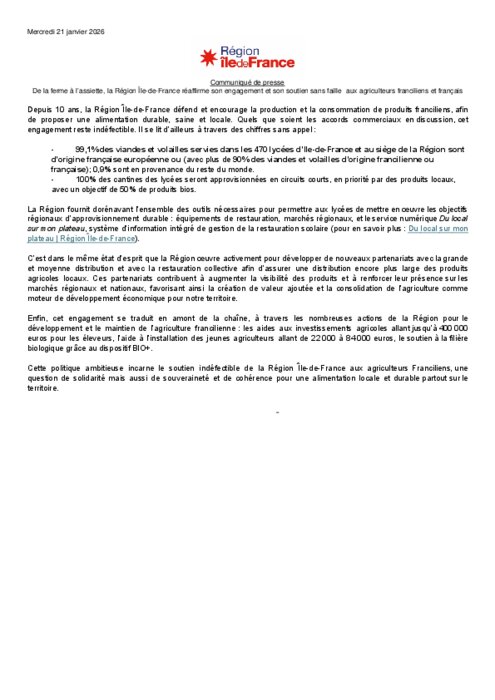 La Région fournit dorénavant l’ensemble des outils nécessaires pour permettre aux lycées de mettre en œuvre les objectifs régionaux d’approvisionnement durable : équipements de restauration, marchés régionaux, et le service numérique Du local sur mon plateau, système d’information intégré de gestion de la restauration scolaire (pour en savoir plus : Du local sur mon plateau | Région Île-de-France).