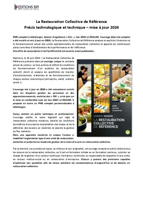 La Restauration Collective de Référence présente dans un ouvrage unique le contexte actuel du secteur. Le livre précise et définit les conditions de fonctionnement d’un système de restauration collectif, décrit et analyse les spécificités de marché, d’environnement, d’attentes et de fonctionnement de chaque secteur économique (entreprise, santé, scolaire, social…).