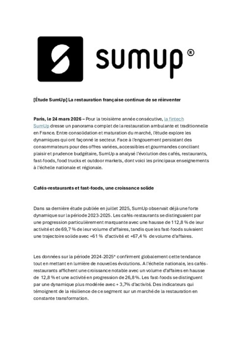 Pour la troisième année consécutive, la fintech SumUp dresse un panorama complet de la restauration ambulante et traditionnelle en France. Entre consolidation et maturation du marché, l’étude explore les dynamiques qui ont façonné le secteur. Face à l’engouement persistant des consommateurs pour des offres variées, accessibles et gourmandes conciliant plaisir et prudence budgétaire, SumUp a analysé l’évolution des cafés, restaurants, fast-foods, food trucks et outdoor markets, dont voici les principaux enseignements à l’échelle nationale et régionale.