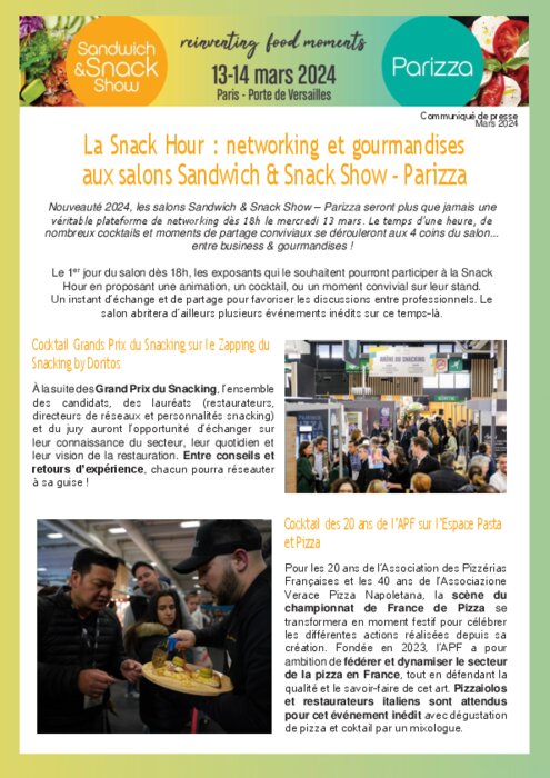 Nouveauté 2024, les salons Sandwich et Snack Show – Parizza seront plus que jamais une véritable plateforme de networking dès 18h le mercredi 13 mars. Le temps d’une heure, de nombreux cocktails et moments de partage conviviaux se dérouleront aux 4 coins du salon... entre business & gourmandises !