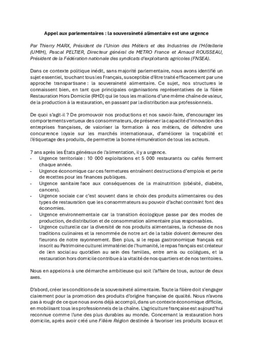 "Dans ce contexte politique inédit, sans majorité parlementaire, nous avons identifié un sujet essentiel, touchant tous les Français, susceptible d’être traité efficacement par une approche transpartisane : la souveraineté alimentaire. Ce sujet, nos structures le connaissent bien, en tant que principales organisations représentatives de la filière Restauration Hors Domicile (RHD) qui lie tous les maillons d’une même chaîne de valeur, de la production à la restauration, en passant par la distribution aux professionnels."