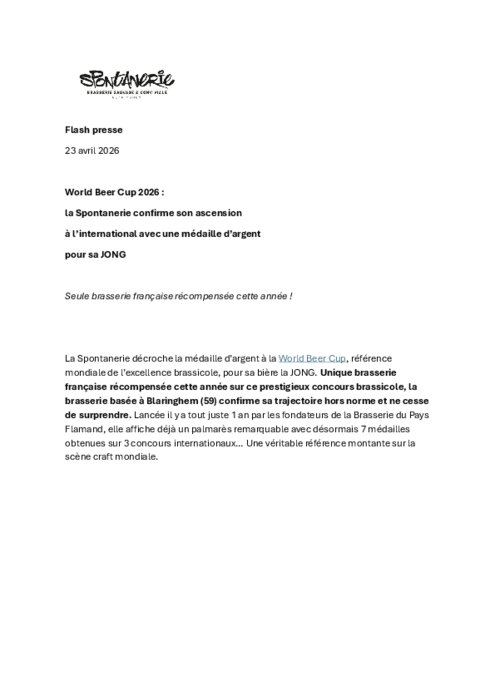 La Spontanerie décroche la médaille d’argent à la World Beer Cup, référence mondiale de l’excellence brassicole, pour sa bière la Jong. Unique brasserie française récompensée cette année sur ce prestigieux concours brassicole, la brasserie basée à Blaringhem (59) confirme sa trajectoire hors norme et ne cesse de surprendre. Lancée il y a tout juste 1 an par les fondateurs de la Brasserie du Pays Flamand, elle affiche déjà un palmarès remarquable avec désormais 7 médailles obtenues sur 3 concours internationaux… Une véritable référence montante sur la scène craft mondiale.