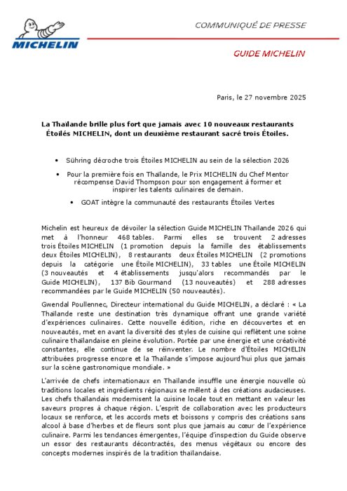 Michelin est heureux de dévoiler la sélection Guide Michelin Thaïlande 2026 qui met à l’honneur 468 tables. Parmi elles se trouvent 2 adresses trois Étoiles Michelin (1 promotion depuis la famille des établissements deux Étoiles Michelin), 8 restaurants deux Étoiles Mi chelin(2 promotions depuis la catégorie une Étoile Michelin), 33 tables une Étoile Michelin (3 nouveautés et 4 établissements jusqu'alors recommandés par le Guide Michelin), 137 Bib Gourmand (13 nouveautés) et 288 adresses recommandées par le Guide Michelin (50 nouveautés).