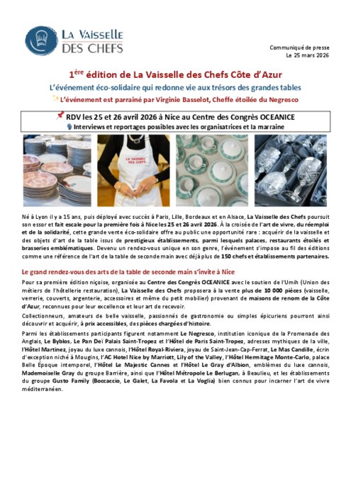 La Vaisselle des Chefs débarque sur la Côte d'Azur à Nice les 25 et 26 avril