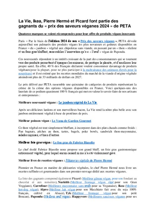 Par le biais de l’édition 2024 de son « Prix des saveurs véganes », PETA dévoile aujourd'hui son palmarès des produits végans les plus novateurs et goûteux disponibles en France – du « jambon » végétal aux chipolotas sans viande, en passant par un « thon » réaliste et un faux gras bluffant, sans oublier l’innovation qu’est « l’œuf » végan de Papondu. Ces nouveautés répondent à un intérêt croissant de la part des consommateurs qui se tournent vers des produits permettant d’épargner les animaux, de protéger la planète, et d’améliorer leur propre santé. En effet, 40 % des Français déclarent vouloir consommer davantage de produits végétaux(pour la plupart, pour ne plus participer à la maltraitance des animaux élevés pour la nourriture) et il est estimé que les recettes mondiales du marché de la viande d'origine végétale atteindront plus de 33 milliards de dollars en 2027.