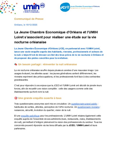 La Jeune Chambre Économique d’Orléans (JCE), en partenariat avec l’UMIH Loiret, lance une vaste enquête auprès des habitants, riverains, professionnels et acteurs de la nuit. L’objectif est de dresser un état des lieux précis de la vie nocturne à Orléans et de proposer des pistes concrètes pour la revitaliser.