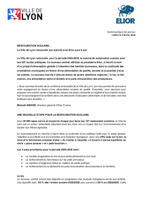 La Ville de Lyon renouvelle, pour la période 2026-2030, le marché de restauration scolaire pour ses 207 écoles publiques. Ce nouveau contrat, attribué au prestataire Elior, s’inscrit au sein d’un projet d’alimentation globale à l’attention des familles lyonnaises, dans la continuité des orientations municipales en faveur d’une alimentation de qualité, durable et accessible à tous les enfants. Le nouveau marché s’articule autour de quatre ambitions majeures : le bio, le fait-maison, une alimentation saine et durable et la juste rémunération des producteurs.