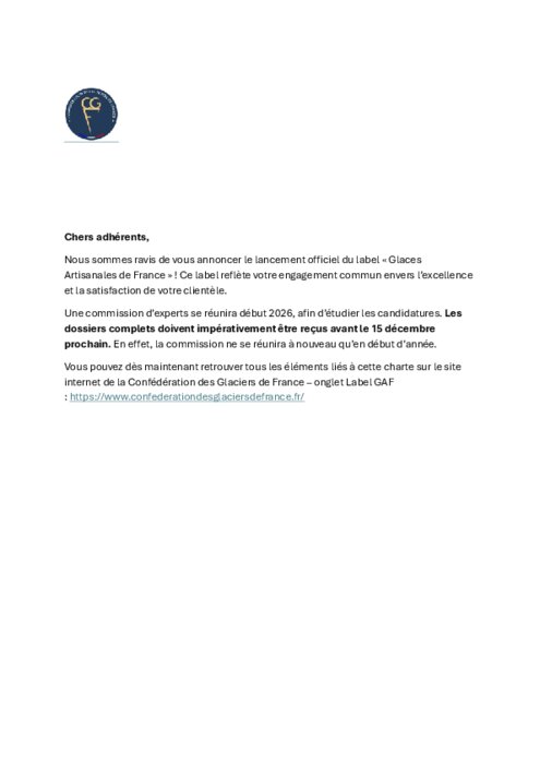 Métiers 13 octobre 2025 - 15:49 Une commission d’experts se réunira début 2026, afin d’étudier les candidatures. Les dossiers complets doivent impérativement être reçus avant le 15 décembre prochain. En effet, la commission ne se réunira à nouveau qu’en début d’année. PDF (41 Ko) Télécharger credit CNGF