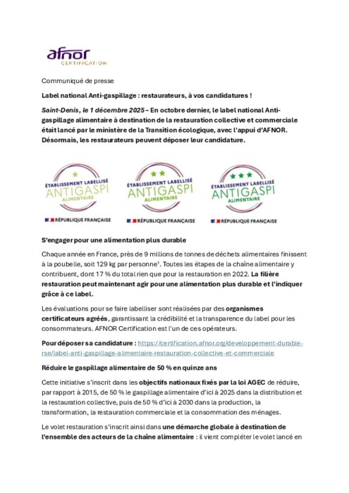 En octobre dernier, le label national Anti-gaspillage alimentaire à destination de la restauration collective et commerciale était lancé par le ministère de la Transition écologique, avec l'appui d’AFNOR. Désormais, les restaurateurs peuvent déposer leur candidature.