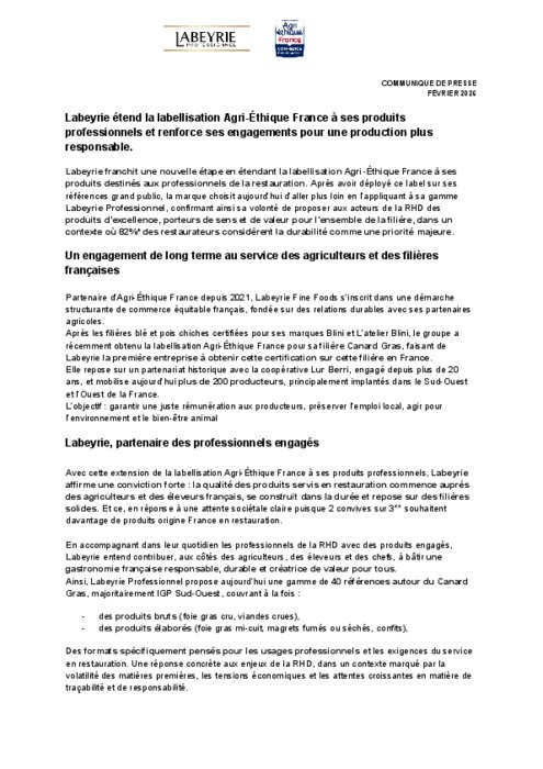Labeyrie franchit une nouvelle étape en étendant la labellisation Agri-Éthique France à ses produits destinés aux professionnels de la restauration. Après avoir déployé ce label sur ses références grand public, la marque choisit aujourd’hui d’aller plus loin en l’appliquant à sa gamme Labeyrie Professionnel, confirmant ainsi sa volonté de proposer aux acteurs de la RHD des produits d’excellence, porteurs de sens et de valeur pour l’ensemble de la filière, dans un contexte où 82%* des restaurateurs considèrent la durabilité comme une priorité majeure.