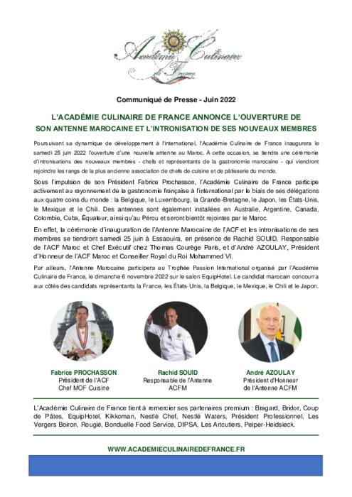 Métiers 15 juin 2022 - 08:25 L’Antenne Marocaine participera notamment au Trophée Passion International organisé par l’Académie Culinaire de France, le dimanche 6 novembre 2022 sur le salon EquipHotel. PDF (201 Ko) Télécharger