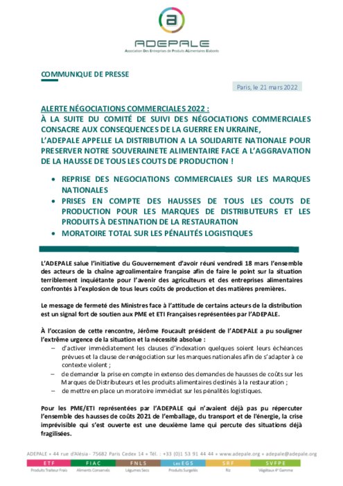 L’ADEPALE salue l’initiative du Gouvernement d’avoir réuni vendredi 18 mars l’ensemble des acteurs de la chaîne agroalimentaire française afin de faire le point sur la situation terriblement inquiétante pour l’avenir des agriculteurs et des entreprises alimentaires confrontés à l’explosion de tous leurs coûts de production et des matières premières.
