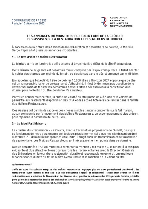 Le ministre a mis en lumière les défis actuels et à venir du titre d’Etat de Maître Restaurateur. Cette démarche exigeante est désormais mieux comprise par les pouvoirs publics. Il fallait adapter le cahier des charges aux réalités du terrain, ce sera le cas dans le décret annoncé par le ministre. En rappelant que l’objectif doit être de délivrer 10 000 titres à l’horizon 2027 et parce que ce titre est un remarquable levier de croissance et d’attractivité, il n’est évidemment pas question de le dévaloriser mais de faciliter les démarches administratives nécessaires à la constitution d’un dossier pour l’obtention du titre de Maître Restaurateur.