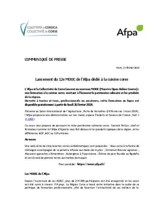 L’Afpa et la Collectivité de Corse lancent un nouveau MOOC (Massive Open Online Course) : une formation à la cuisine corse, mettant à l’honneur le patrimoine culinaire et les produits de la région. Ouverte à toutes et tous, professionnels ou amateurs, cette formation en ligne est disponible gratuitement à partir du lundi 26 février .
