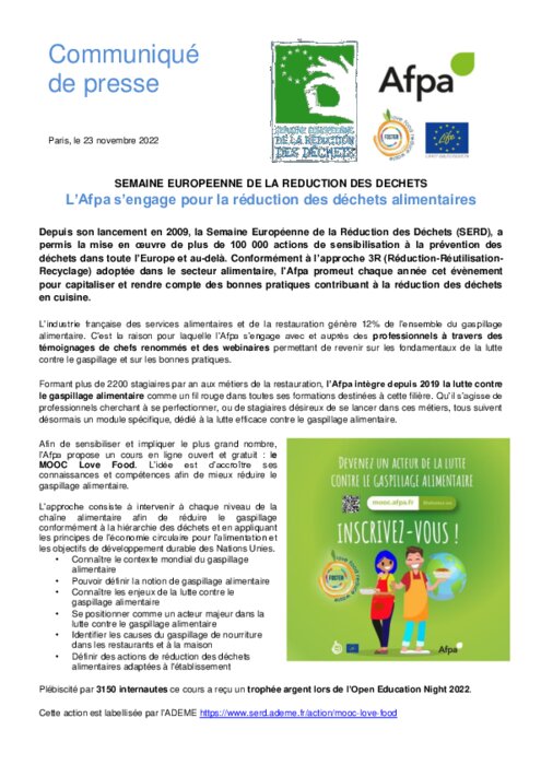 Métiers 23 novembre 2022 - 12:45 Depuis son lancement en 2009, la Semaine Européenne de la Réduction des Déchets (SERD), a permis la mise en œuvre de plus de 100 000 actions de sensibilisation à la prévention des déchets dans toute l'Europe et au-delà. PDF (254 Ko) Télécharger