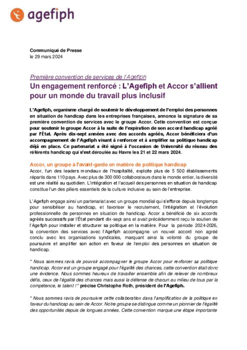 L’Agefiph, organisme chargé de soutenir le développement de l’emploi des personnes en situation de handicap dans les entreprises françaises, annonce la signature de sa première convention de services avec le groupe Accor. Cette convention est conçue pour soutenir le groupe Accor à la suite de l’expiration de son accord handicap agréé par l’État.