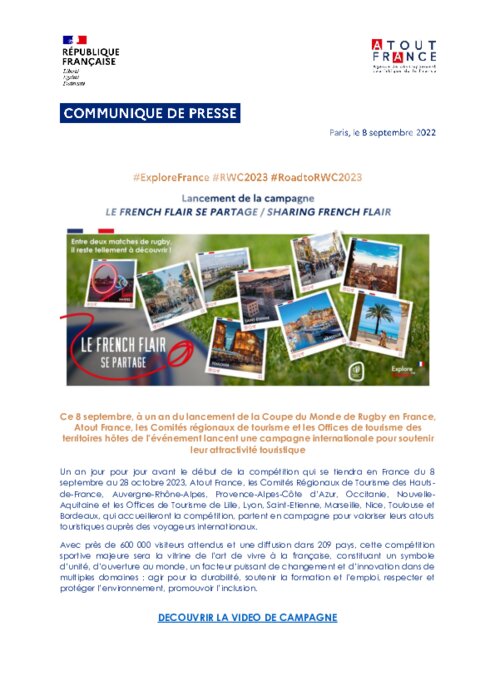 Métiers 08 septembre 2022 - 10:13 Atout France, les Comités régionaux de tourisme et les Offices de tourisme des territoires hôtes de l'événement lancent une campagne internationale pour soutenir leur attractivité touristique. PDF (361 Ko) Télécharger