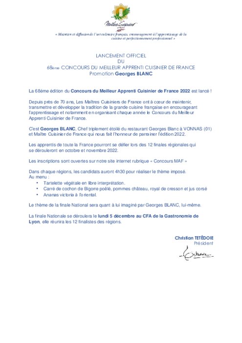 Depuis près de 70 ans, Les Maîtres Cuisiniers de France ont à cœur de maintenir, transmettre et développer la tradition de la grande cuisine française en encourageant l’apprentissage et notamment en organisant chaque année le Concours du Meilleur Apprenti Cuisinier de France.