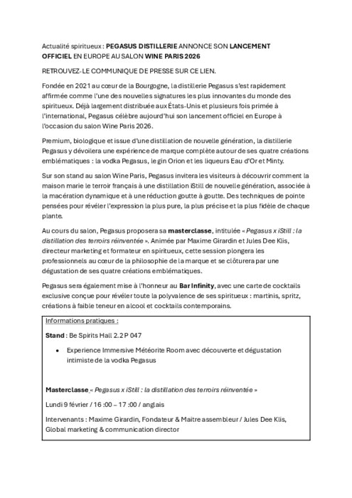 Fondée en 2021 au cœur de la Bourgogne, la distillerie Pegasus s’est rapidement affirmée comme l’une des nouvelles signatures les plus innovantes du monde des spiritueux. Déjà largement distribuée aux États-Unis et plusieurs fois primée à l’international, Pegasus célèbre aujourd’hui son lancement officiel en Europe à l’occasion du salon Wine Paris 2026.
