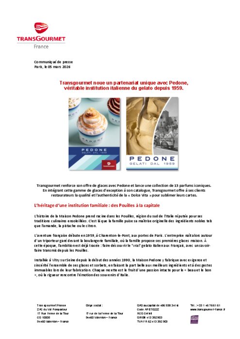 Distributeurs 05 mars 2026 - 14:28 Pour Pedone et Transgourmet, la qualité commence par le respect de la terre. La gamme puise sa force dans des ingrédients bruts, sourcés directement auprès de producteurs historiques et passionnés. PDF (1 Mo) Télécharger