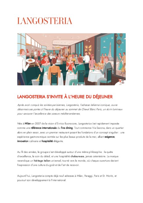 Après avoir conquis les soirées parisiennes, Langosteria, l’adresse italienne iconique, ouvre désormais ses portes à l’heure du déjeuner au sommet de Cheval Blanc Paris, un écrin lumineux pour savourer l’excellence des saveurs méditerranéennes.