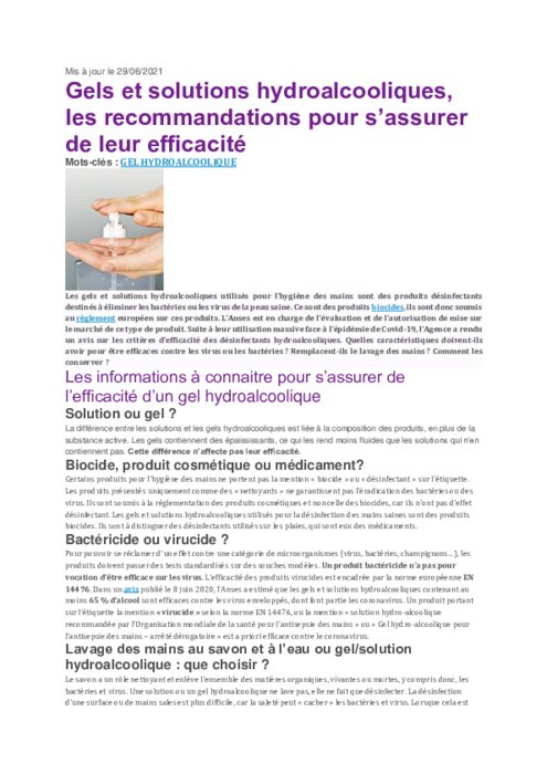 L'Anses donne son avis complémentaire sur l’efficacité des gels hydroalcooliques