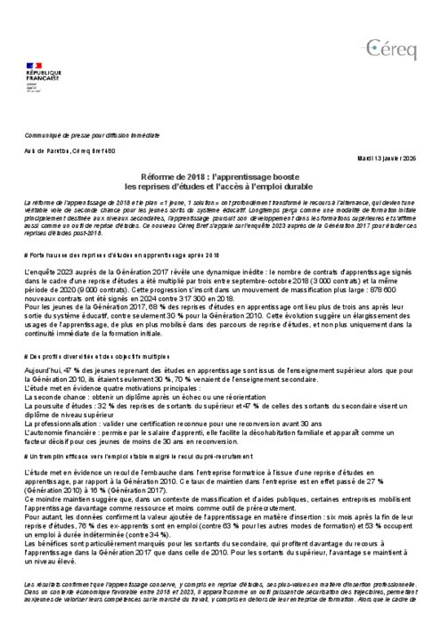 La réforme de l'apprentissage de 2018 et le plan « 1 jeune, 1 solution » ont profondément transformé le recours à l'alternance, qui devient une véritable voie de seconde chance pour les jeunes sortis du système éducatif. Longtemps perçu comme une modalité de formation initiale principalement destinée aux niveaux secondaires, l'apprentissage poursuit son développement dans les formations supérieures et s’affirme aussi comme un outil de reprise d’études. Ce nouveau Céreq Bref s’appuie sur l’enquête 2023 auprès de la Génération 2017 pour étudier ces reprises d’études post-2018.