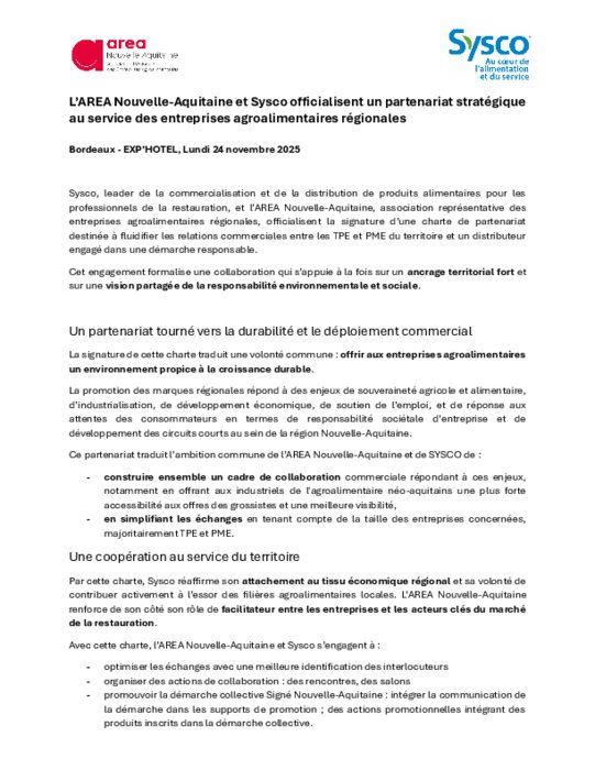 Sysco, leader de la commercialisation et de la distribution de produits alimentaires pour les professionnels de la restauration, et l’AREA Nouvelle-Aquitaine, qui représente les entreprises agroalimentaires régionales, officialisent la signature d’une charte de partenariat. Celle-ci vise à favoriser des relations commerciales plus fluides entre les TPE et PME du territoire et un distributeur engagé dans une démarche responsable.