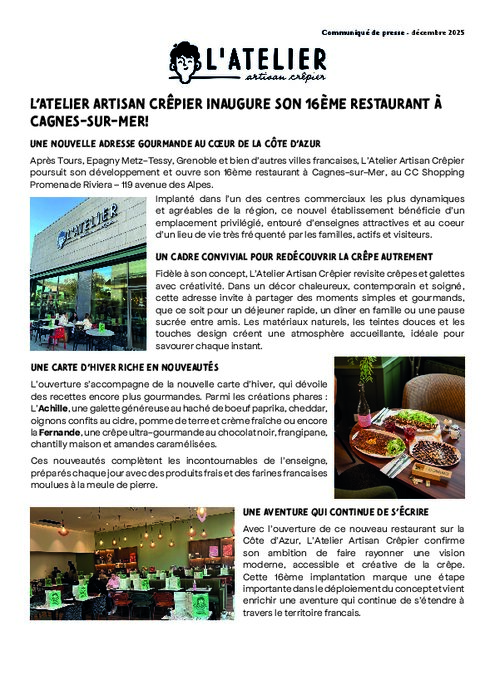 Restauration commerciale 03 décembre 2025 - 12:12 Après Tours, Epagny Metz-Tessy, Grenoble et bien d’autres villes francaises, L’Atelier Artisan Crêpier poursuit son développement et ouvre son 16e restaurant à Cagnes-sur-Mer, au CC Shopping Promenade Riviera – 119 avenue des Alpes. PDF (2 Mo) Télécharger
