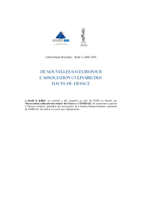 Le lundi 8 juillet, un cocktail a été organisé au sein de l’INFA Le Manoir par l’Association culinaire des Hauts-de-France et l’UMIH 60. Cet événement a permis à Thomas Lefebvre, président de l’association, et à Charles-Édouard Barbier, président de l’UMIH 60, de mettre en avant leur collaboration.