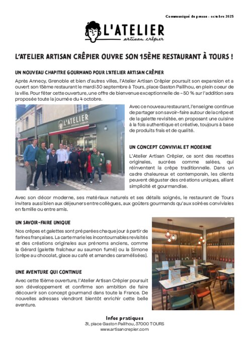 Après Annecy, Grenoble et bien d’autres villes, l’Atelier Artisan Crêpier poursuit son expansion et a ouvert son 15ème restaurant le mardi 30 septembre à Tours, place Gaston Paillhou, en plein coeur de la ville. Pour fêter cette ouverture, une offre de bienvenue exceptionnelle de - 50 % sur l’addition sera proposée toute la journée du 4 octobre.