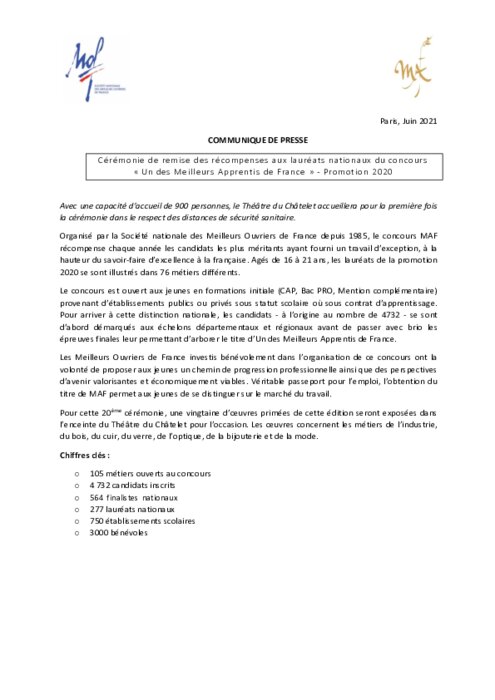 La remise nationale des diplômes et médailles aux 277 lauréats de la promotion 2020 du concours Un des Meilleurs Apprentis de France se tiendra lundi 21 juin 2021, en présence des lauréats et de leurs familles, de Meilleurs Ouvriers de France ainsi que de nombreuses personnalités du monde politique et de l’entreprise.