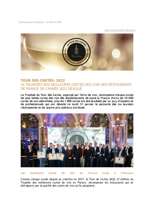 Métiers 01 février 2022 - 17:57 Le Trophée du Tour des Cartes, organisé par Terre de vins, récompense chaque année les plus belles cartes des vins des établissements de toute la France. PDF (428 Ko) Télécharger