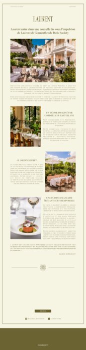 Pour accompagner cette renaissance, Cordelia de Castellane imagine un décor qui réinterprète l’élégance intemporelle de Laurent. Entre classicisme parisien et sens du détail, la directrice artistique compose un univers chaleureux et sophistiqué où se mêlent tissus précieux, tonalités délicates et boiseries patinées, dans un dialogue permanent avec le jardin qui entoure le pavillon.