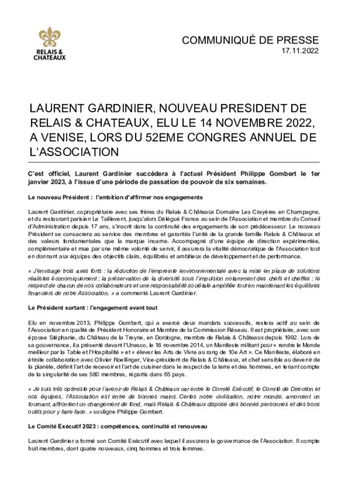 Laurent Gardinier succèdera à l’actuel Président Philippe Gombert le 1er janvier 2023, à l’issue d’une période de passation de pouvoir de six semaines. Le Chef Mauro Colagreco – restaurant triplement étoilé Le Mirazur, Menton – succèdera quant à lui à Olivier Roellinger, en tant que Vice-Président, en charge des Chefs.