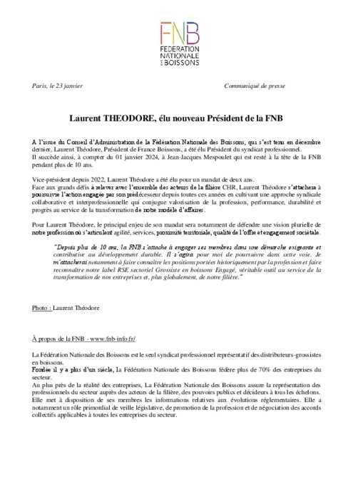 Métiers 23 janvier 2024 - 11:14 Il succède ainsi, à compter du 01 janvier, à Jean-Jacques Mespoulet qui est resté à la tête de la FNB pendant plus de 10 ans. PDF (123 Ko) Télécharger