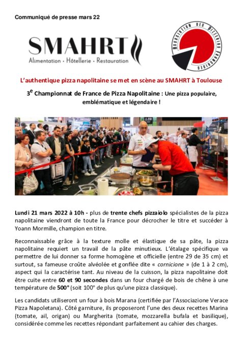 Métiers 04 mars 2022 - 08:05 Lundi 21 mars à 10h : 3ème Championnat de France de la pizza napolitaine : Plus de trente chefs pizzaiolo spécialistes de la pizza napolitaine viendront de toute la France pour décrocher le titre et succéder à Yoann Mormille, champion en titre. PDF (321 Ko) Télécharger
