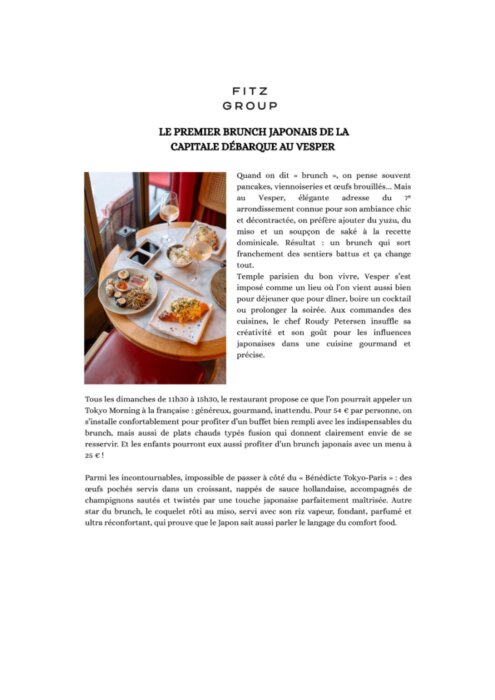 Le Vesper crée l’événement en lançant le tout premier brunch japonais de la capitale. Au menu, une expérience inédite mêlant traditions nippones et codes du brunch contemporain. Saveurs umami, produits soigneusement sélectionnés et présentation raffinée composent ce rendez-vous gourmand. Une nouveauté qui promet de séduire les amateurs de cuisine japonaise en quête d’originalité.