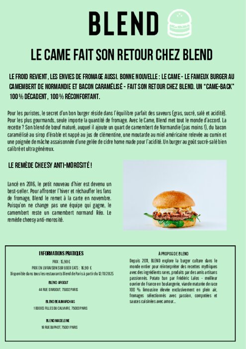 Snacking 17 novembre 2025 - 15:32 Le froid revient, les envies de fromage aussi. Bonne nouvelle: le Came- le fameux burger au camembert de Normandie et bacon caramélisé - fait son retour chez Blend. Un “came-back” 100% décadent,100% réconfortant. PDF (423 Ko) Télécharger © Blend © Blend