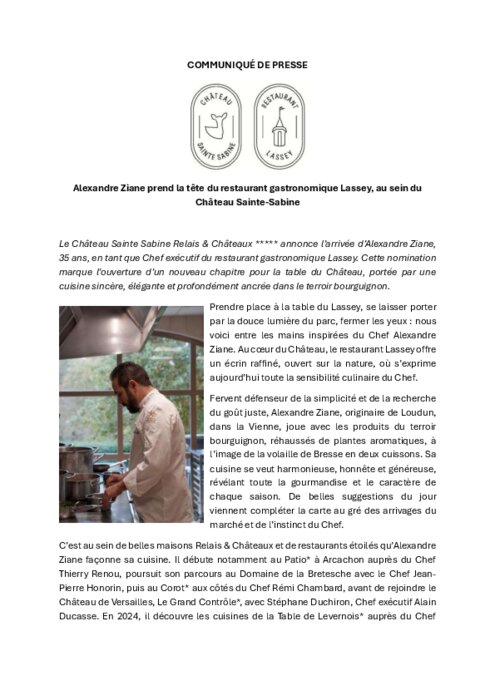 Le Château Sainte Sabine Relais & Châteaux annonce l’arrivée d’Alexandre Ziane, 35 ans, en tant que chef exécutif du restaurant gastronomique Lassey. Cette nomination marque l’ouverture d’un nouveau chapitre pour la table du Château, portée par une cuisine sincère, élégante et profondément ancrée dans le terroir bourguignon.