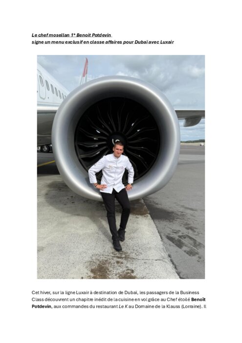 Cet hiver, sur la ligne Luxair à destination de Dubaï, les passagers de la business class découvrent un chapitre inédit de la cuisine en vol grâce au Chef étoilé Benoît Potdevin, aux commandes du restaurant Le K au Domaine de la Klauss (Lorraine). Il signe pour Luxair une carte exclusive, pensée pour sublimer les saveurs malgré l’altitude.