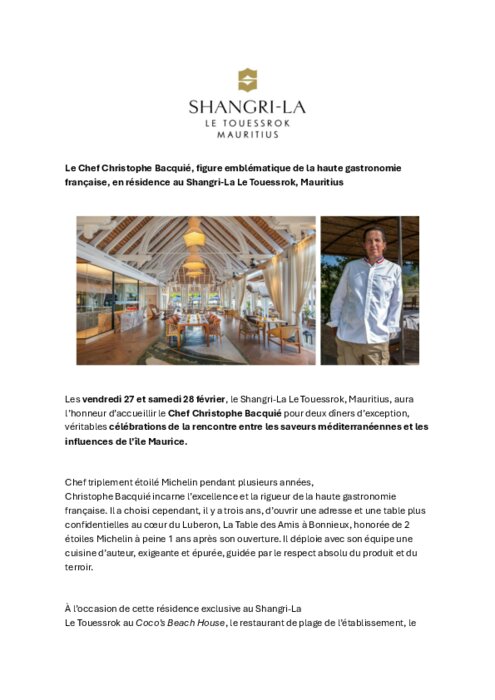 Le chef Christophe Bacquié en résidence au Shangri-La Le Touessrok, Mauritius