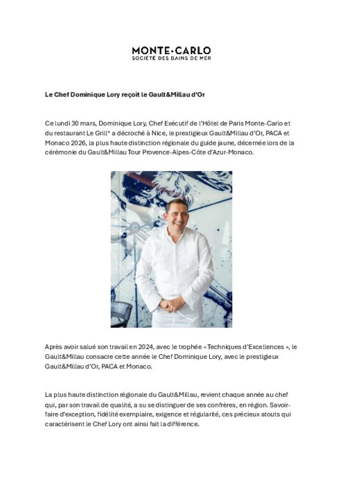 Ce lundi 30 mars, Dominique Lory, chef exécutif de l’Hôtel de Paris Monte-Carlo et du restaurant Le Grill a décroché à Nice, le prestigieux Gault&Millau d’Or, PACA et Monaco 2026, la plus haute distinction régionale du guide jaune, décernée lors de la cérémonie du Gault&Millau Tour Provence-Alpes-Côte d’Azur-Monaco.