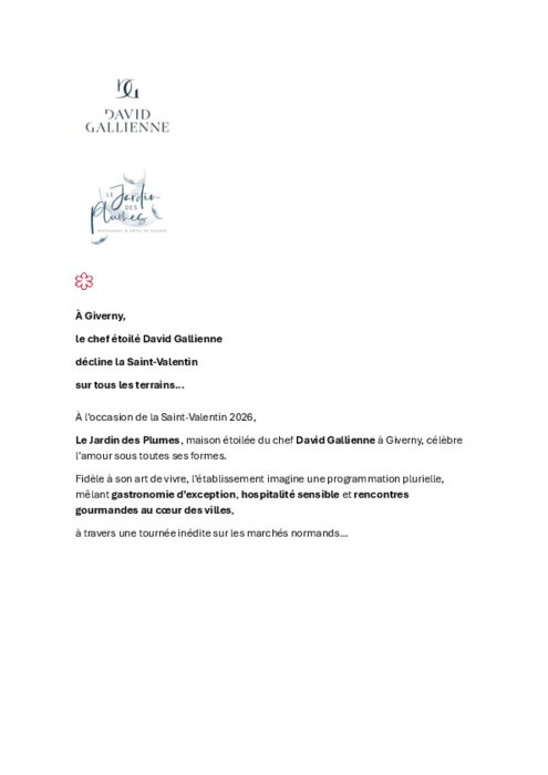 Le Jardin des Plumes, maison étoilée du chef David Gallienne à Giverny, célèbre l’amour sous toutes ses formes. Fidèle à son art de vivre, l’établissement imagine une programmation plurielle, mêlant gastronomie d’exception, hospitalité sensible et rencontres gourmandes au cœur des villes.